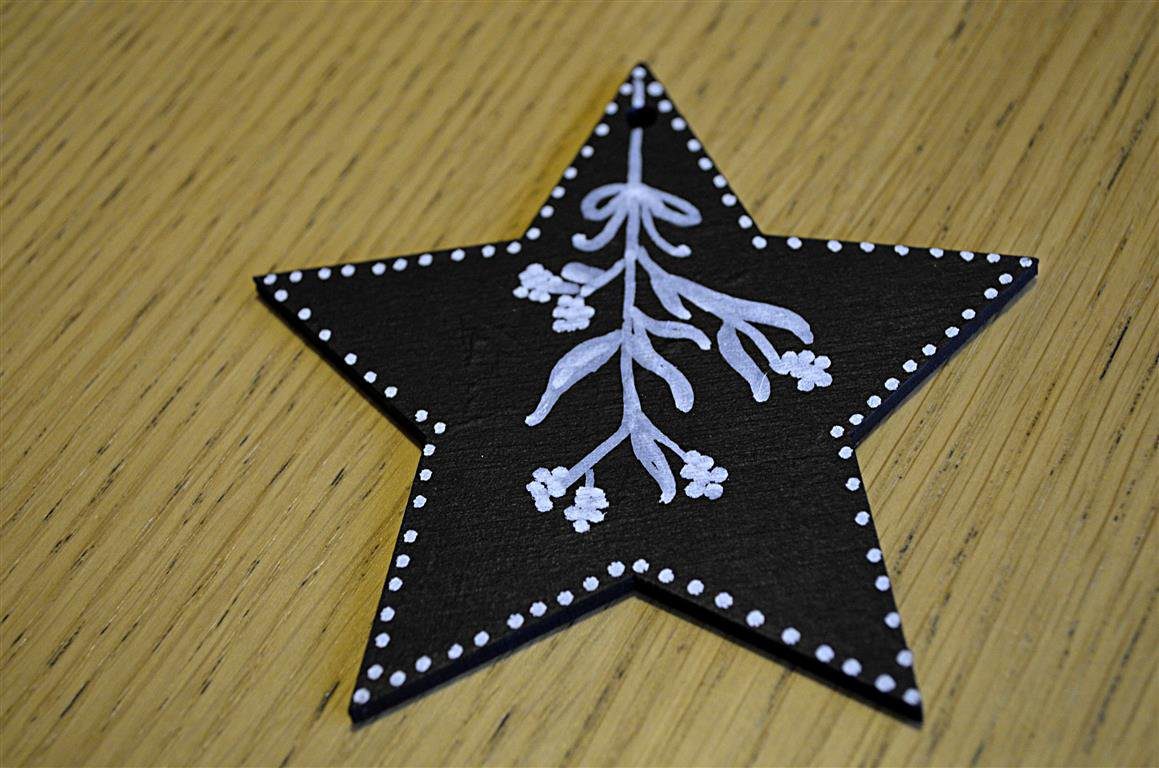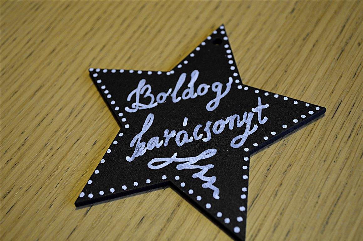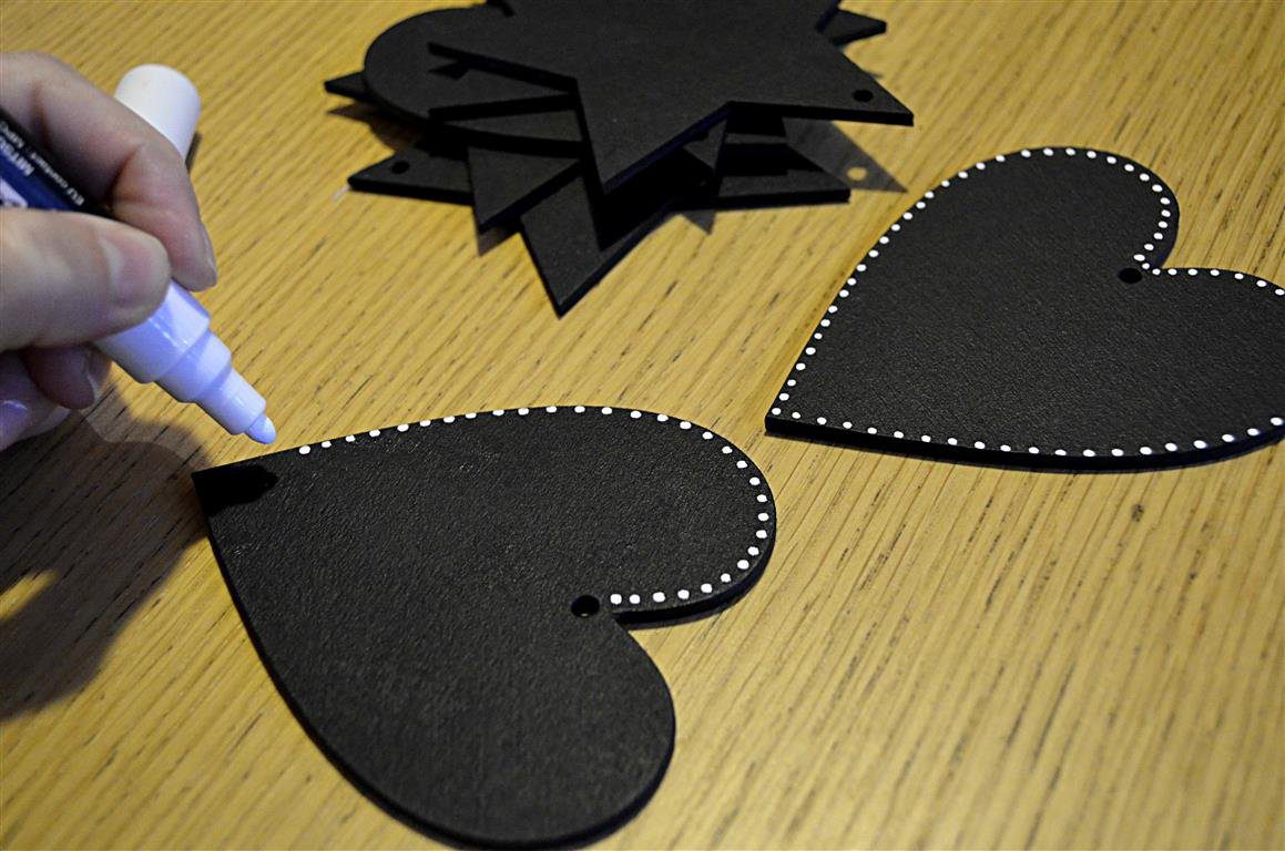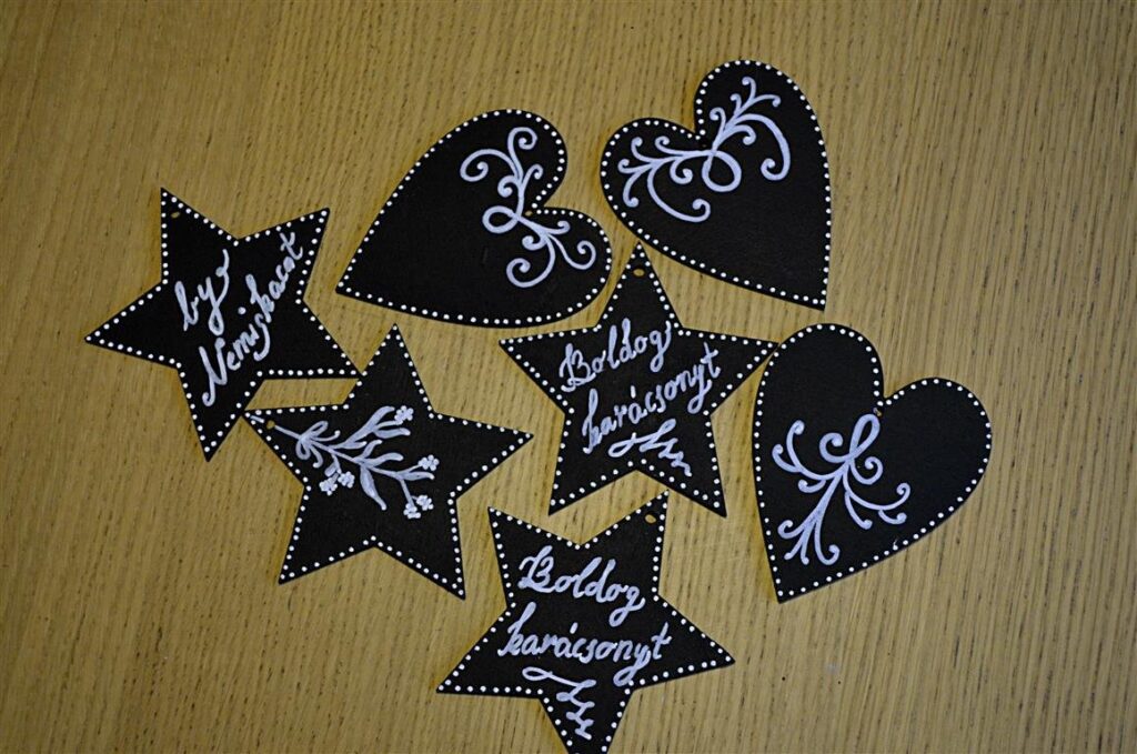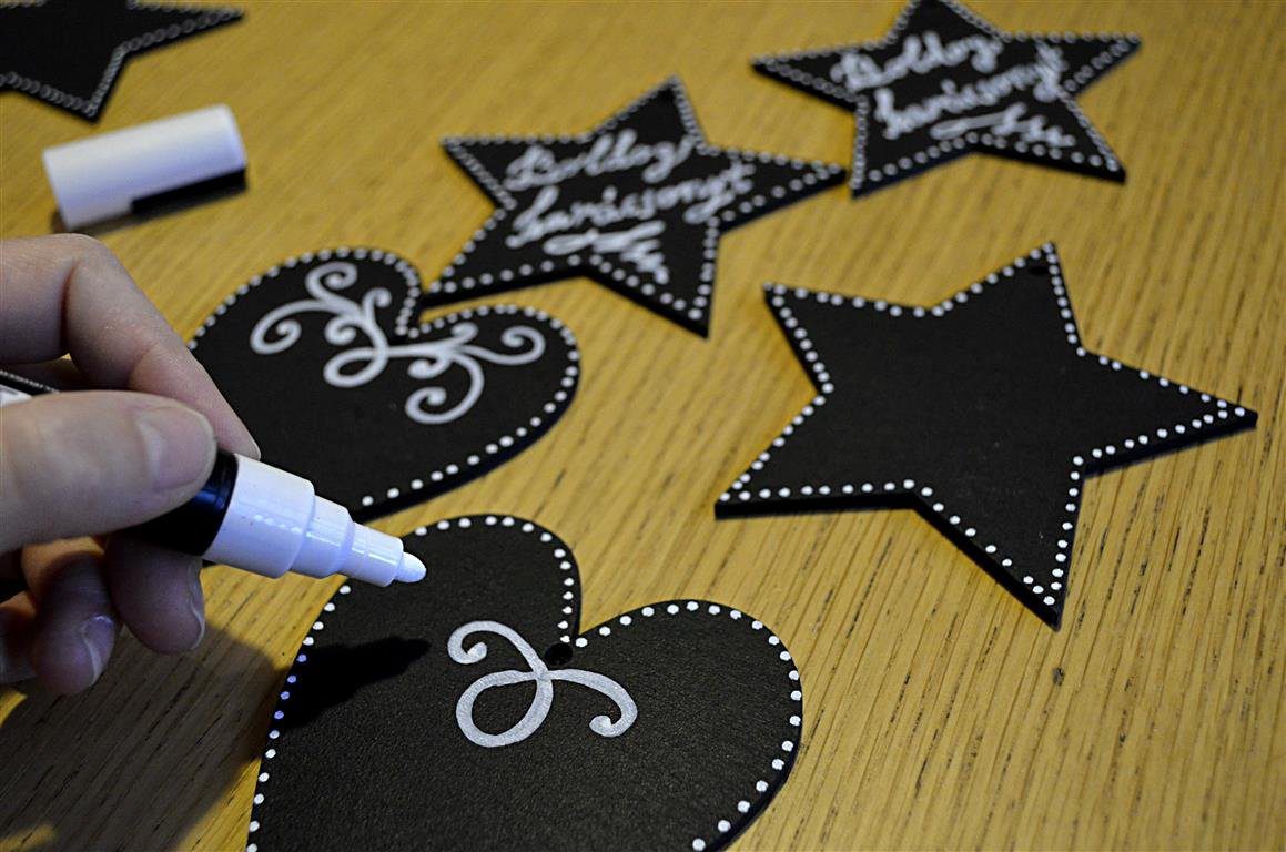 Natúr, kezeletlen díszeket vásároltam és festettem le fekete táblafestékkel, majd nem krétával, hanem fehér színű Posca filctollal dekoráltam, mert azt – a krétával ellentétben – nem lehet letörülni, de az illúzió olyan, mintha krétával lenne kifestve.