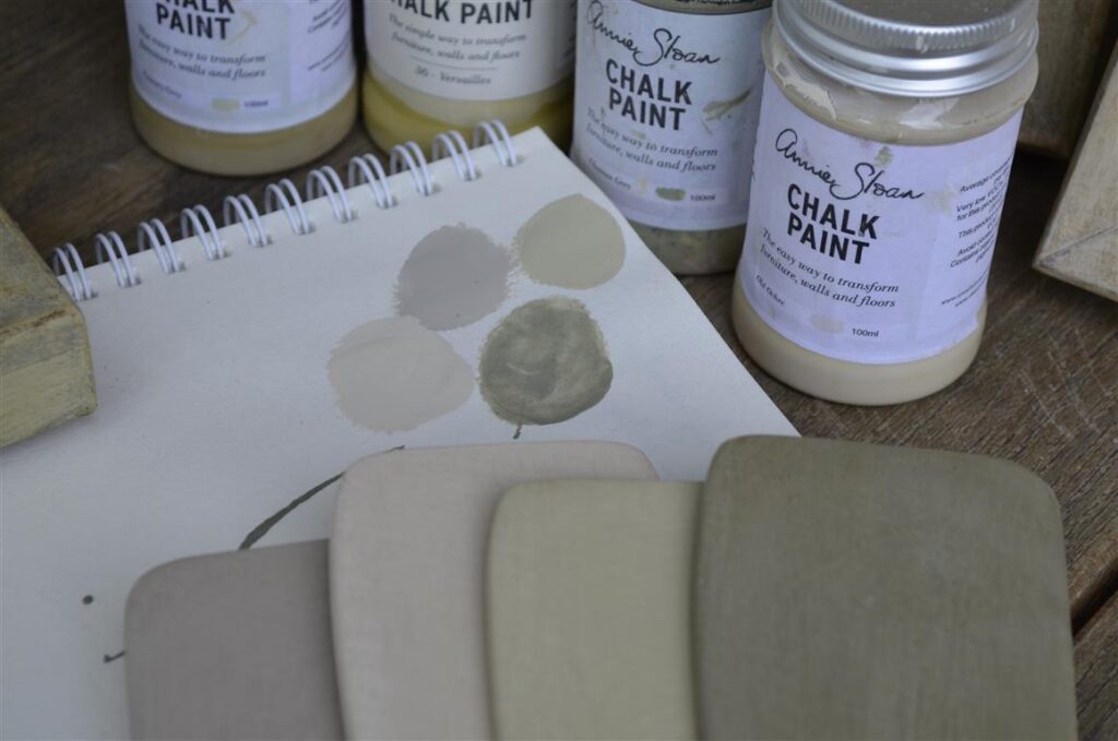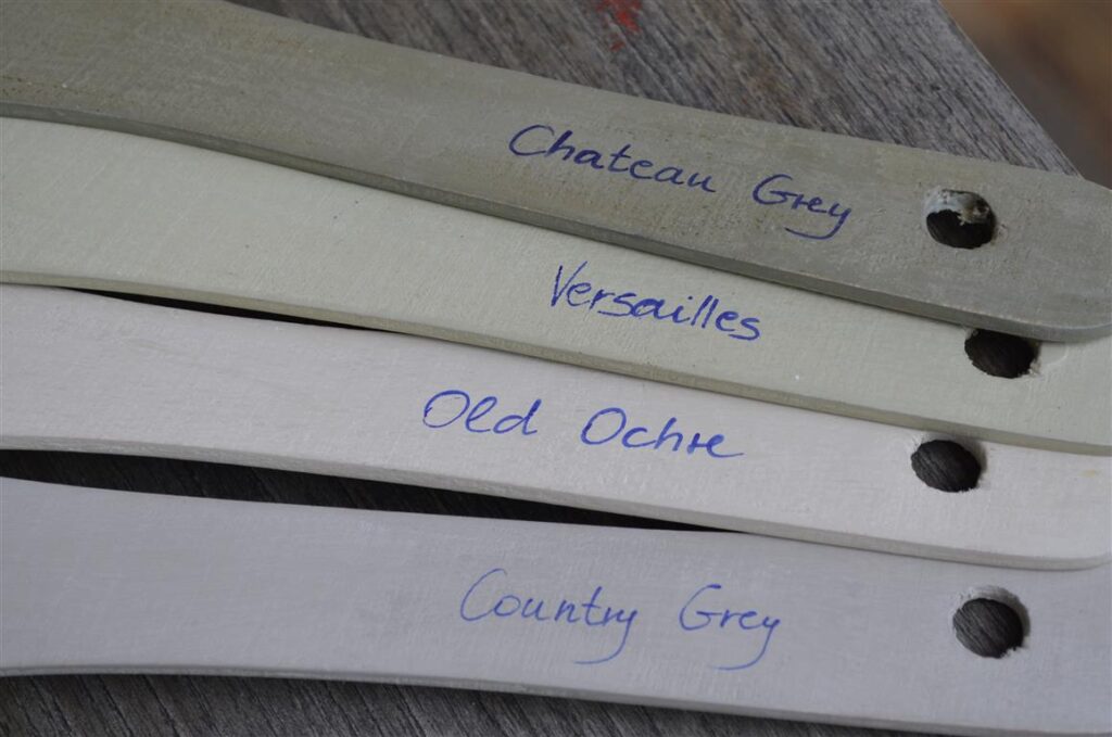 Zsóka natúr és zöldes színeket választott a palettáról. Ezt követte a mintatáblák elkészítése, próbafestés, majd Zsóka kiválasztotta a konkrét színt az ablakokra. Kívülre a Chateau Grey-t, belülre pedig annak egy világosabb változatát, amit Old Ochre színnel higítottuk 1:2 arányban.