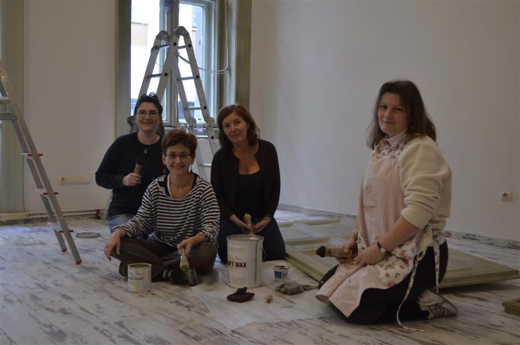 A lenti képen a festő Csapat: Zsuzsi (balra), Klári (elöl), én és Marina, aki operatívan segítette Zsókát, hogy a lakás berendezésével, kialakításával kapcsolatos tervei és ötletei teljes mértékben megvalósulhassanak. Örülök, hogy megismerhettem.