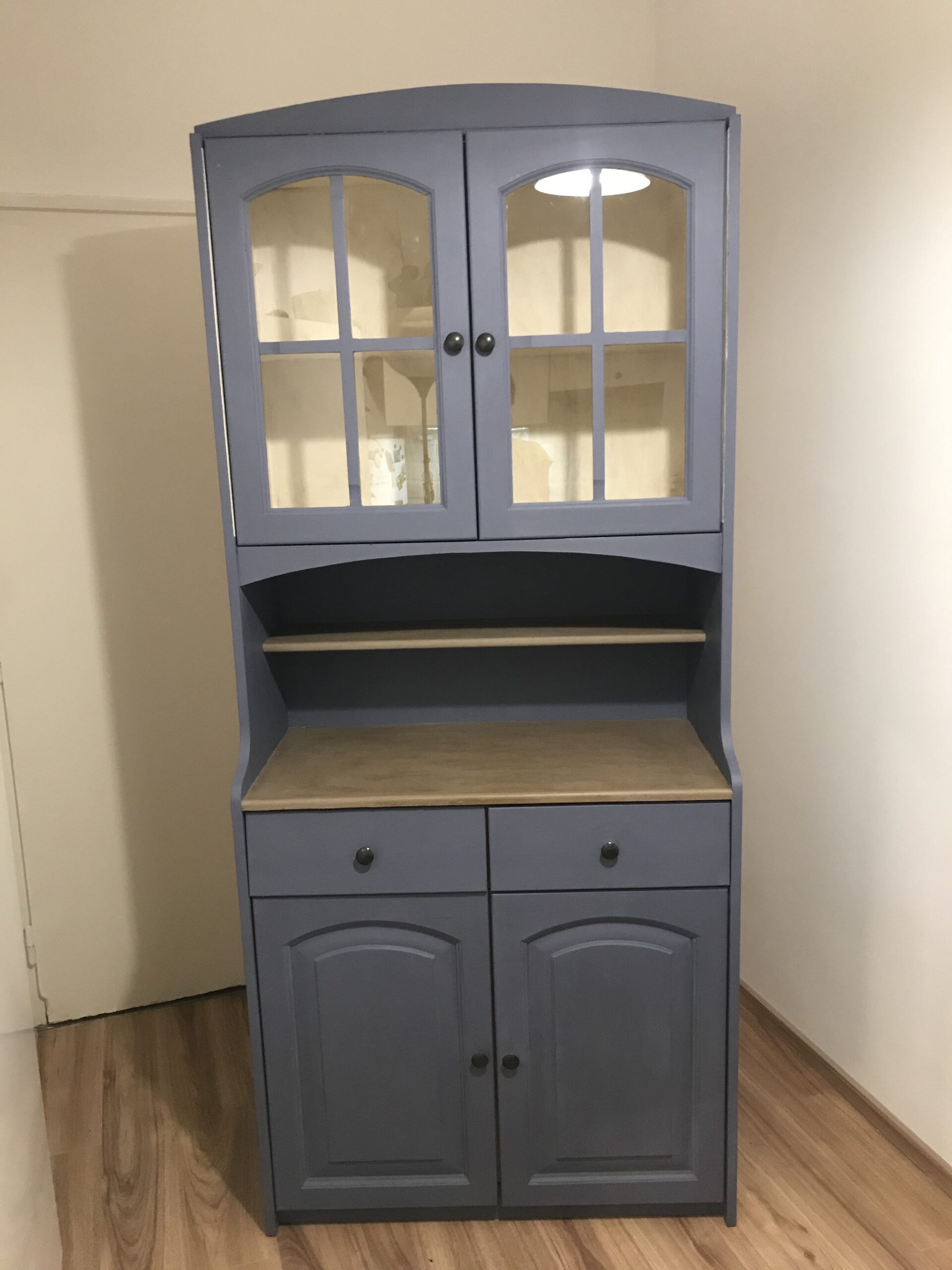 Körülbelül 1 liter Old Violet Krétafestékre, három rétegben. A szekrény belső részére pedig Old White Krétafesték 120 ml-es kiszerelésére volt szükség szintén három rétegben.