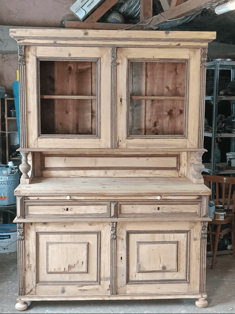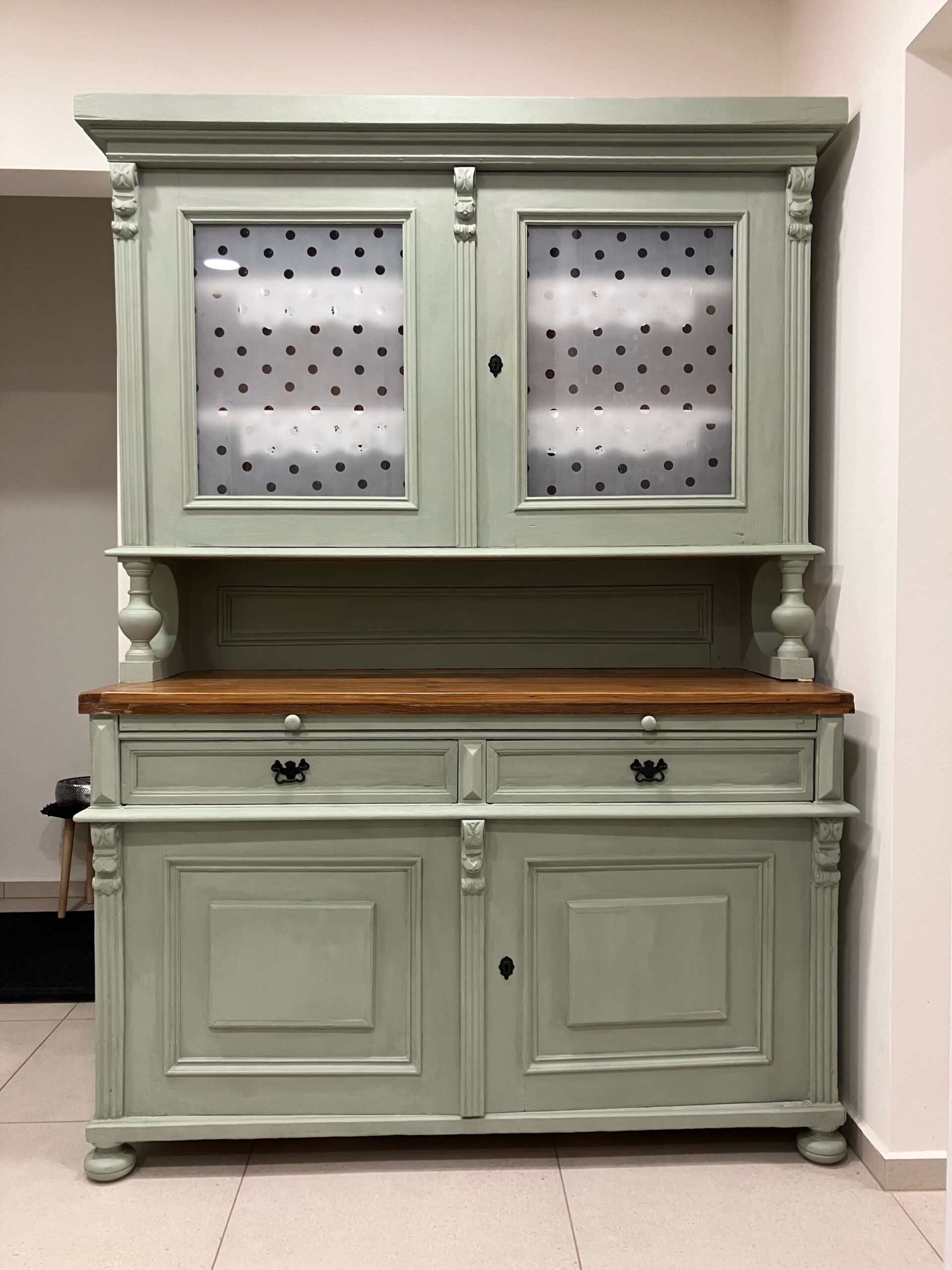 Eszter alaposan megküzdött ezzel a szekrénnyel, az előkészítő munkáltatok, a javítgatások is sok idő a szekrény rossz állapota miatt. Majd sajnos átvérzésbe is belefutott, ami egy ritka, de előforduló jelenség régi bútorok festésénél. Sikerült blokkolni az átvérzést, és több napos munka után végül teljes pompájában ragyog a bútor.