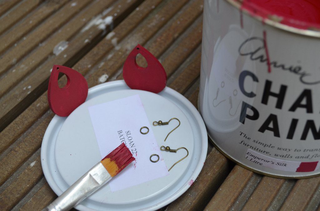 Szóval megláttam ezt a fa fülbevalót is, és eszembe jutott, hogy a múltkor felvettem az új piros cipellőm és nem volt hozzá piros fülbevalóm, viszont az asztal festése után maradt piros Annie Sloan festékem.