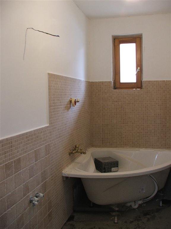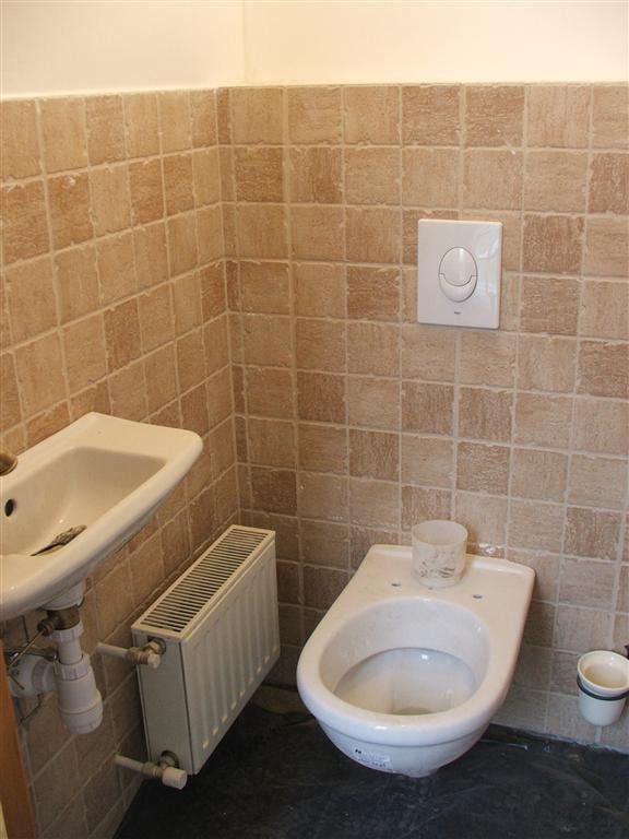 A wc-be nem kértem a díszcsikot a mozaik lapokból, csak hagytam simán. Direkt nincs magasra csempézve itt sem.