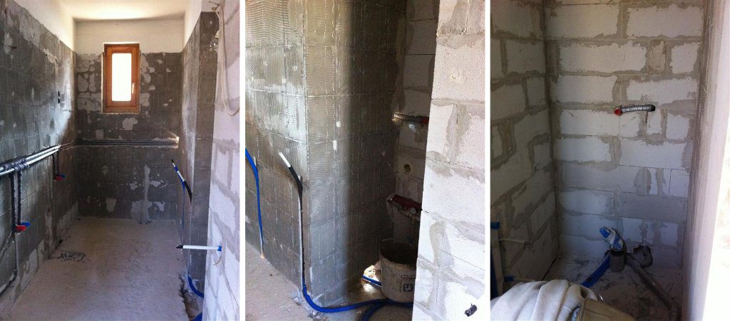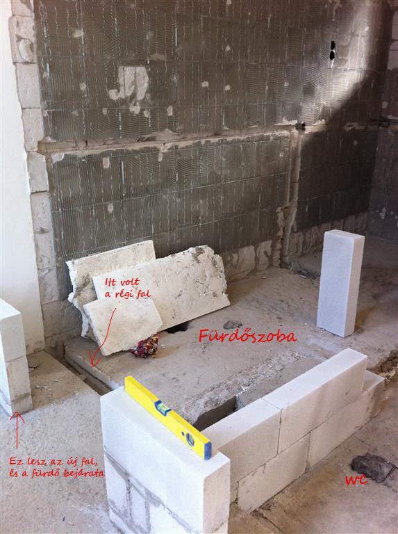 Meglett az új fal. Kicsit féltünk, hogy nem lesz-e a fürdőszoba túl hosszú és keskeny, de szerencsére a mosógépnek sikerült egy beugrót építeni, így az nincs útban.