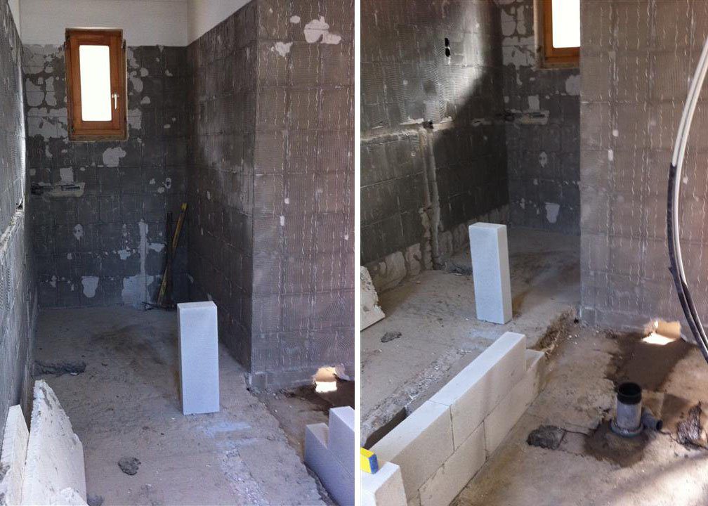 Ott a jobb csücsök miatt, alul, volt egy kis leállás. Emlékszem, külön ki kellett menjek megnézni, hogy mennyire egyenesítsék ki a kád ívét. (A takarítás miatt) Persze akkor még nem volt bent a kád, így húztunk a kivitelezővel egy képzeletbeli vonalat a földön…olyan, hát biztos jó lesz alapon. Ezen a ponton is jól jött volna a belsőépítész segítsége.