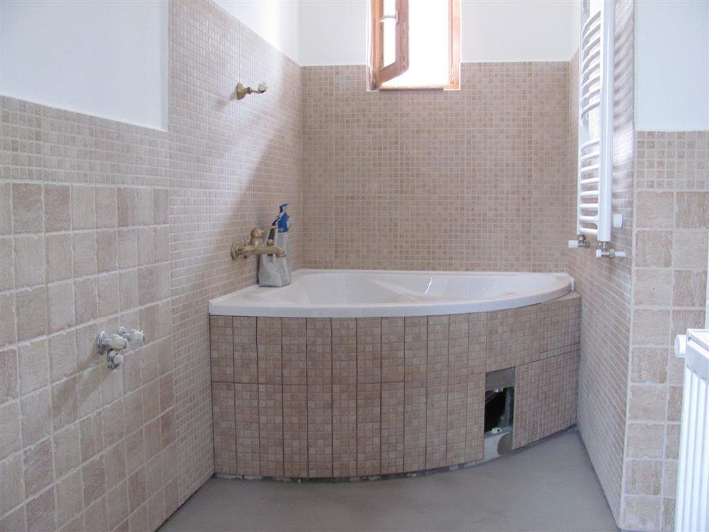 Csempének valami rusztikusat szerettem volna, bézs színben. Olyat, ami nem sima, textúrája van, pl. rücskös, és van belőle mozaik is, mert azt gondoltam ki, hogy mozaik legyen a kád körül hátul magasabban csempézve – mert a mozaik elegáns – és a nagyobb „kockájú” csempe legyen a többi helyen, de alacsonyabban úgy kb. 120 cm-ig csempézve. Épp, ami szükséges, a többi legyen fehérre festett sima fal.