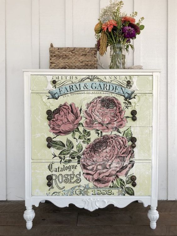 A festett felületre felvitt Catalogue of Roses transzfer ugyanúgy zárni kell Clear Chalk Paint Waxszal vagy Chalk Paint lakkal.