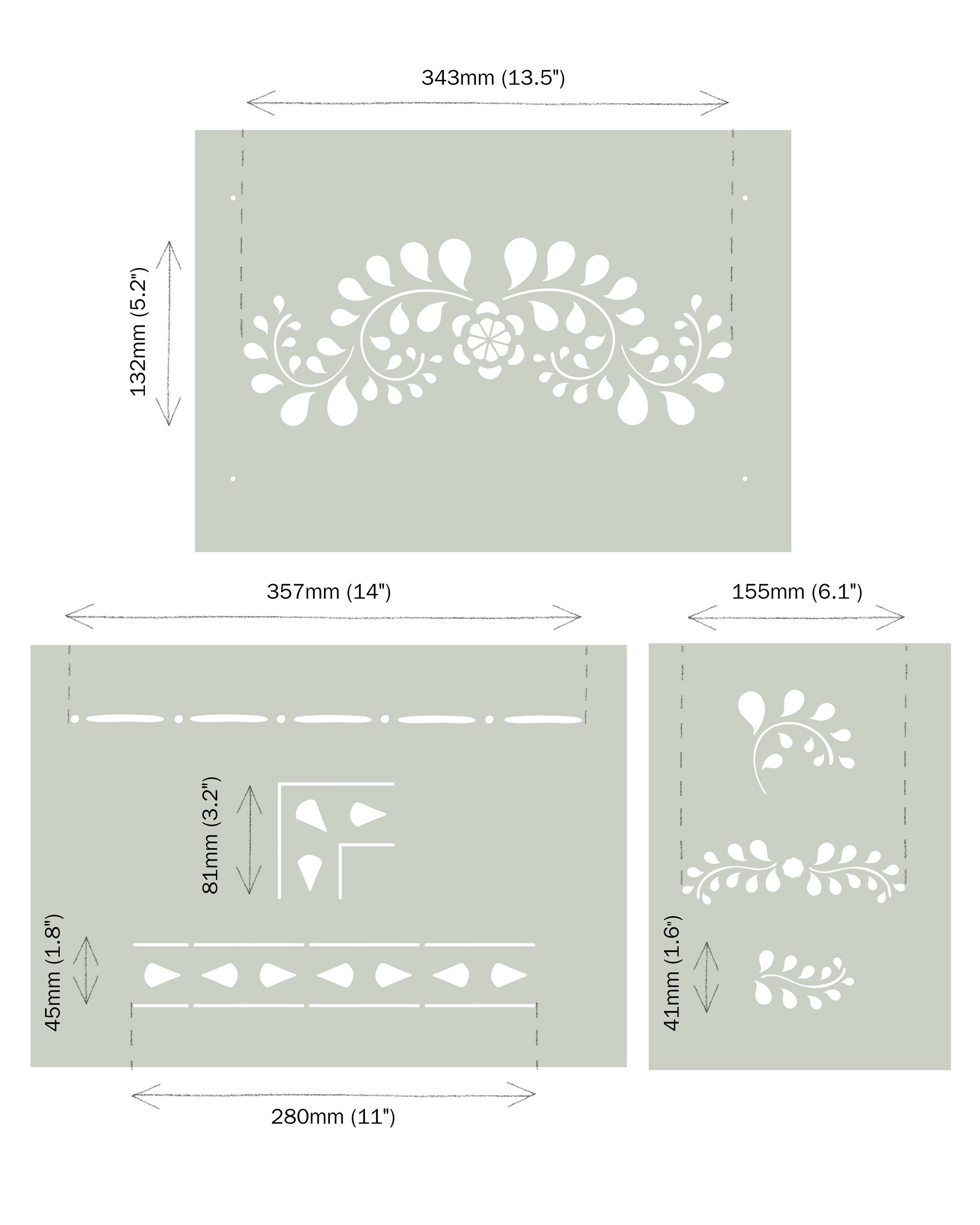 A csontberakás mintát imitáló stencil sablon három különálló darabból áll, a fő betétmintátból, valamint szegélyek és sarkok választékából, illetve kisebb díszítésekből, melyek variálásával teljesen egyénire és személyre szabhatod a látványt.