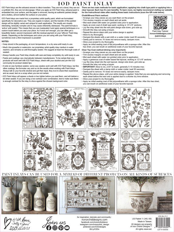 Az IOD Paint Inlay – ezen belül a Floriography Paint Inlay – vadonatúj, kiváló minőségű művészeti termék egy újfajta mintafestési koncepcióval. A dekor transzferekre adott kézműves válasz, mely se nem matrica, se nem szintetikus film, és nem is decoupage.