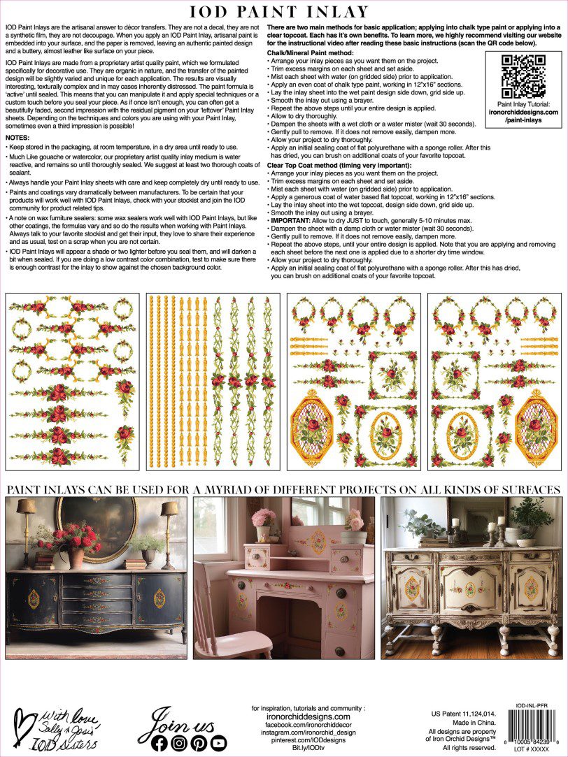 Az IOD Paint Inlay – ezen belül a Petite Fleur Red Paint Inlay is – egy vadonatúj, kiváló minőségű művészeti termék egy újfajta mintafestési koncepcióval. A dekor transzferekre adott kézműves válasz, mely se nem matrica, se nem szintetikus film, és nem is decoupage.