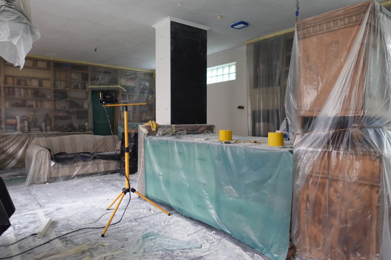 A konyhabútor teljes lefestése végül is három hónapig húzódott, mert közbejött a konyha falainak festése is. Így miután a konyhasziget egyik oldalával már készen lettem, a konyhát és a nappalit is kis időre kompletten bezacskóztuk. Felköltöztünk a padlástérre két teljes hétre, amíg folyt a plafon és a falak festése.