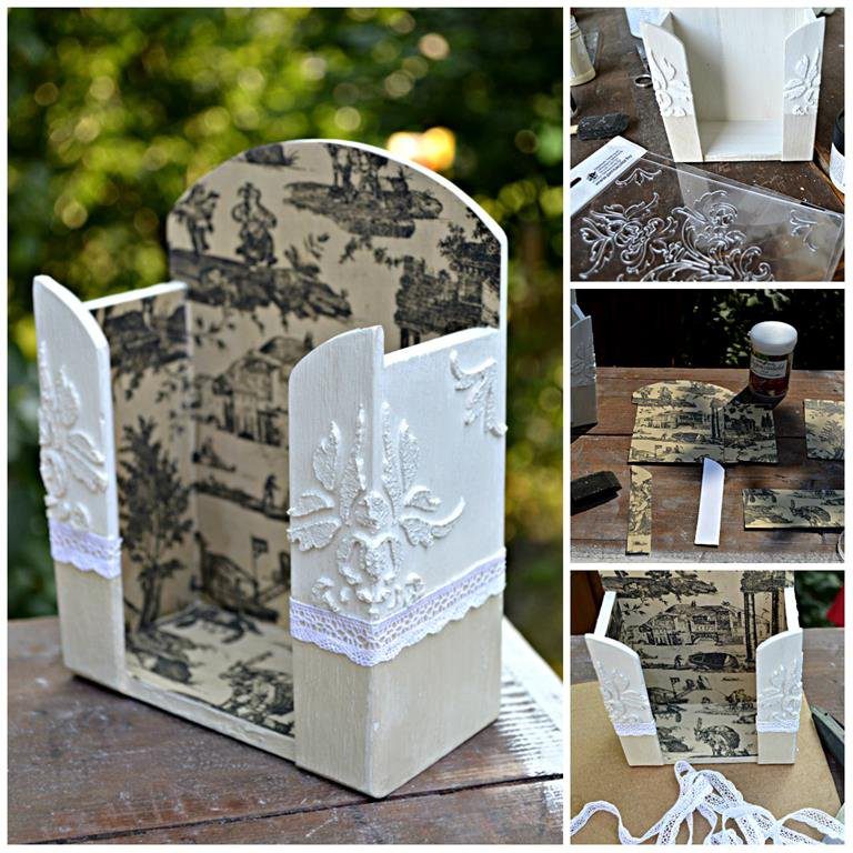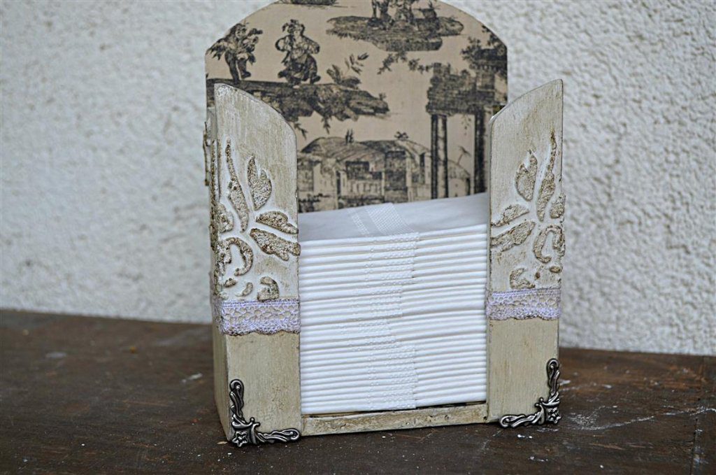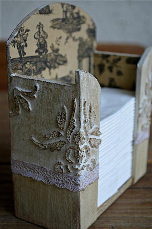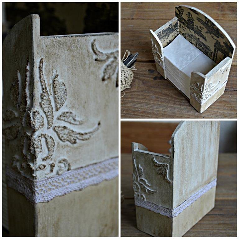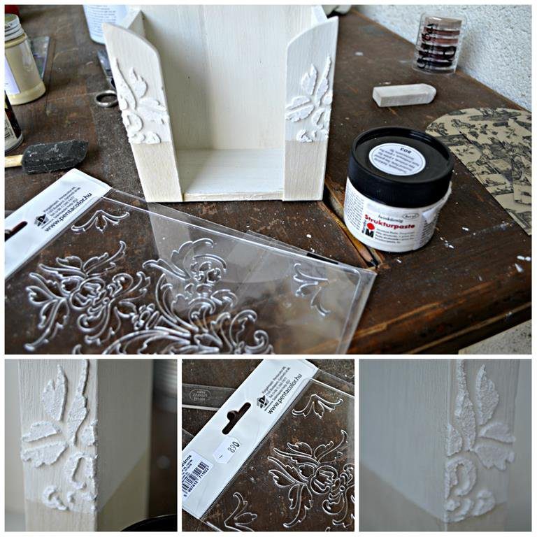 Készen lett a zsebkendőtartó. A struktúrpasztával való stencilezés azért tetszik nagyon, mert teljesen gyakorlatlan kéz is elsőre látványosat, szépet tud vele alkotni.