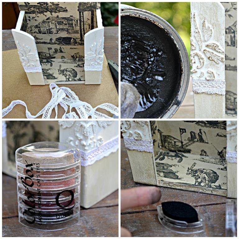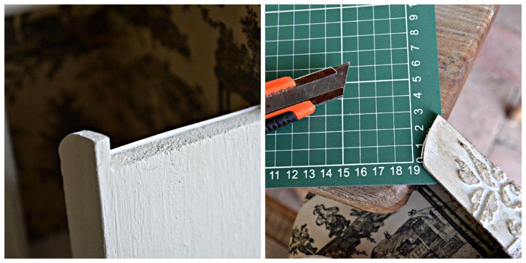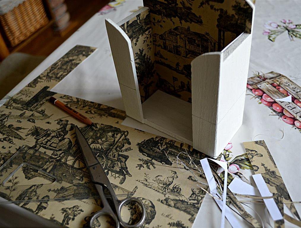Az egészet befestettem fehérre és amíg száradt, kiszabtam a papírt, amivel a belső részét díszítettem, majd bejelöltem vonalzóval, hogy hol kell a sötétebb krémszszínnel fessem.