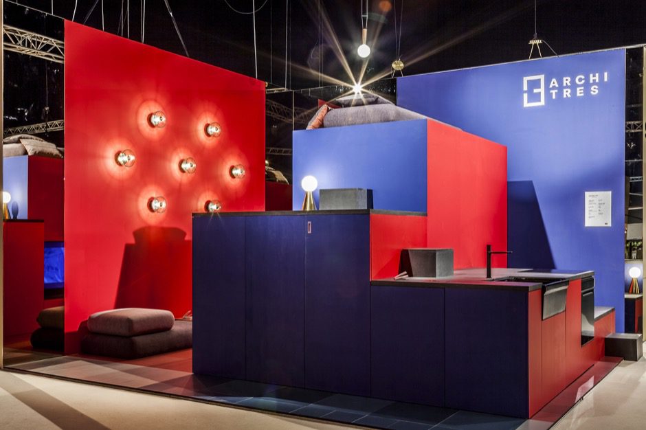 A térelemek fehér laminált lapokból készültek, amelyeket az Emperor’s Silk vad vöröse és a Napoleonic Blue hasonlóan intenzív kékje keltett életre. A háttérben, a vízszintes felületeken a Graphite megbízható sötétsége tartott ellen az ütős színkombinációnak.